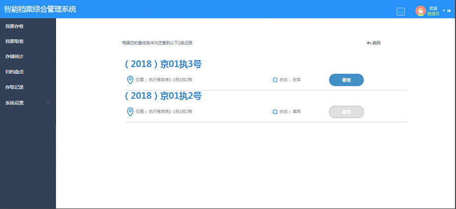 系统利用快速检索技术对档案存放信息进行检索,实现一键查询、一键取卷,免去人工线下查档工作量,提升查档取卷效率。