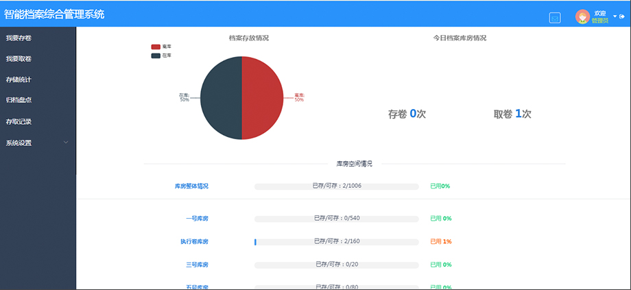 系统对库房卷宗存取情况及库房剩余存储空间实时统计,并同步进行图表动态展示,方便用户直观查看当前库房存储各项情况。