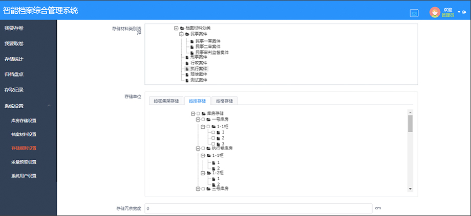 系统支持后台灵活配置,用户可在后台对档案库房存储、材料类型、存储规则进行详尽配置,系统对存储规则支持一柜存放多类材料及档案顺序