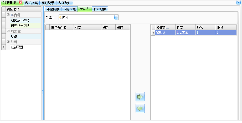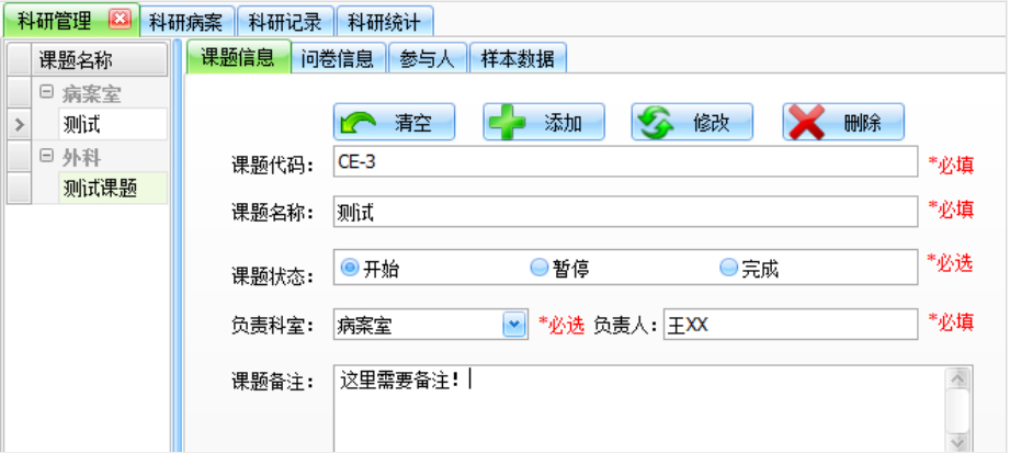 左侧是课题名称,凡事添加过的都会在左边按照科室名称罗列出来。