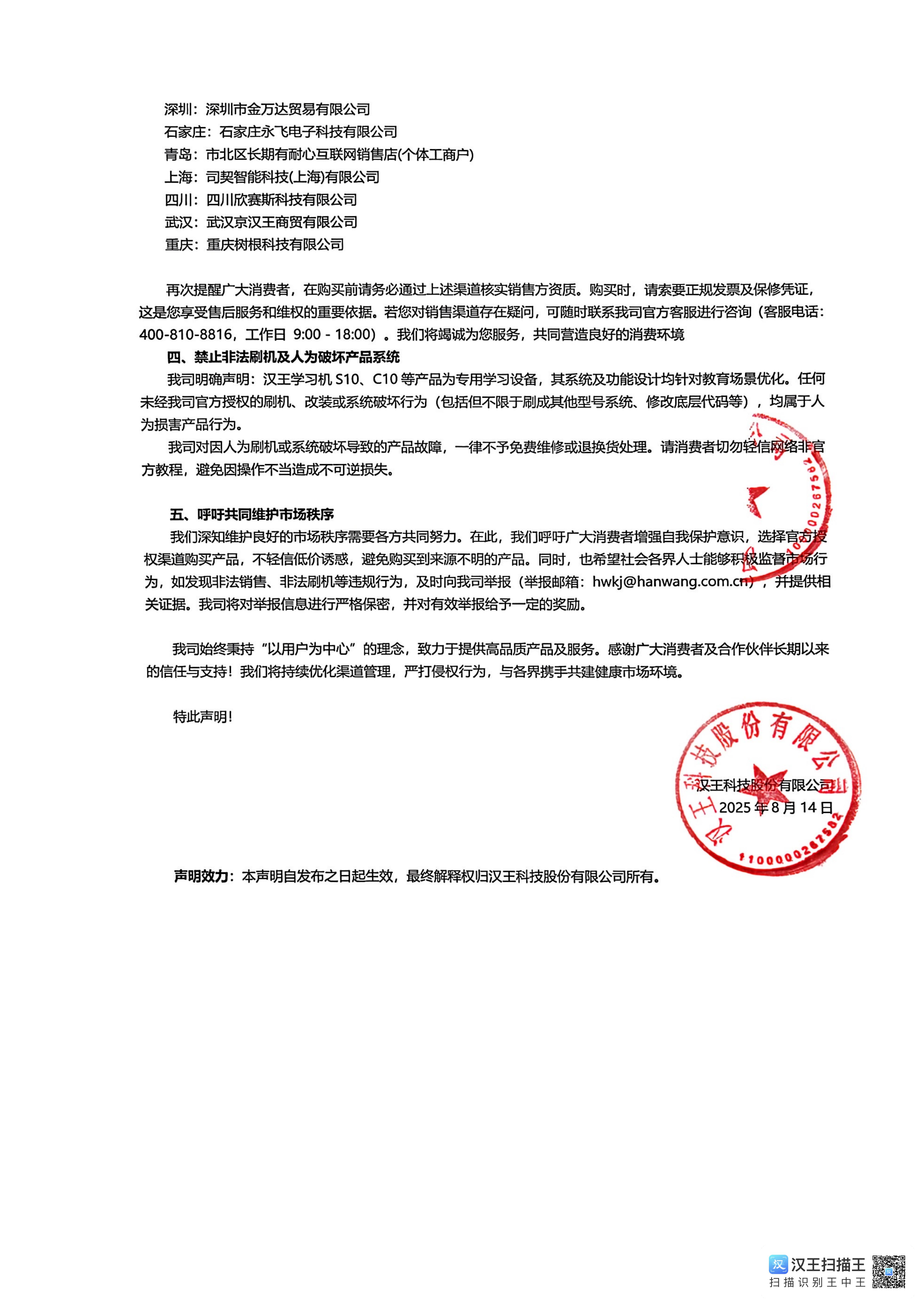 近日,汉王科技发现市场上出现部分未经授权渠道低价销售汉王学习本产品的情况,同时个别消费者因擅自刷机导致产品损坏,进而引发不合理售后诉求。此类行为已严重扰乱市场秩序并损害消费者合法权益。对此,公司已发布《汉王科技股份有限公司关于规范产品销售渠道及维护市场秩序的严正声明》,优化渠道管理,严打侵权行为,与各界携手共建健康市场环境。 声明如下: